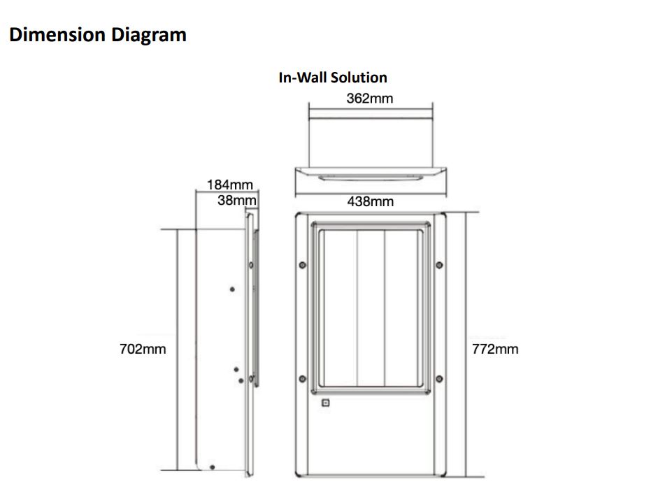 IW25-5 In-Wall Dehumidifier with combined Bi-Polar Ionization Technology is recessed and fits in a fabricated wall or through a 90 x 35mm stud wall. For semi-recessed applications, an IDS Exterior Sleeve (sold separately) can be used.